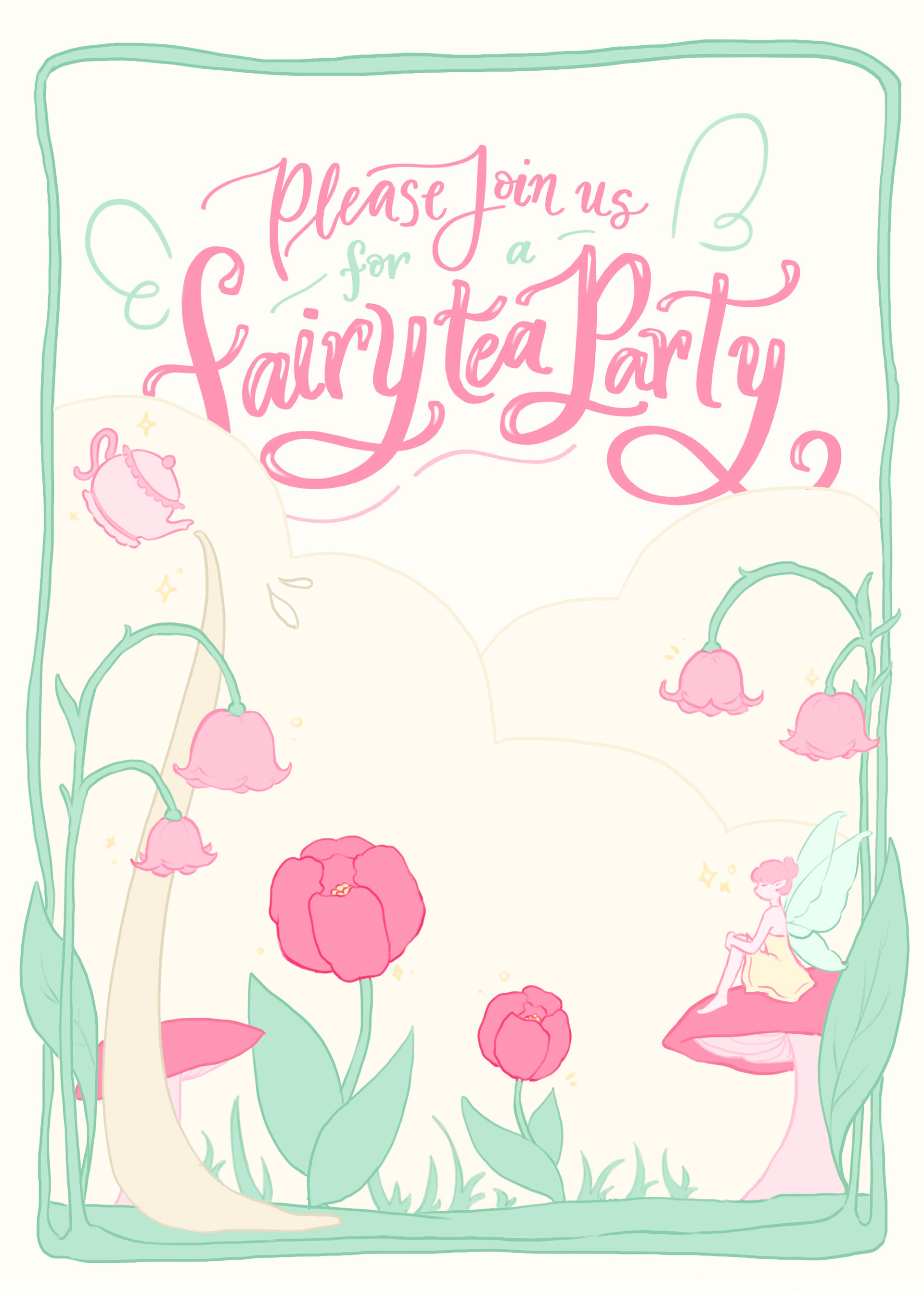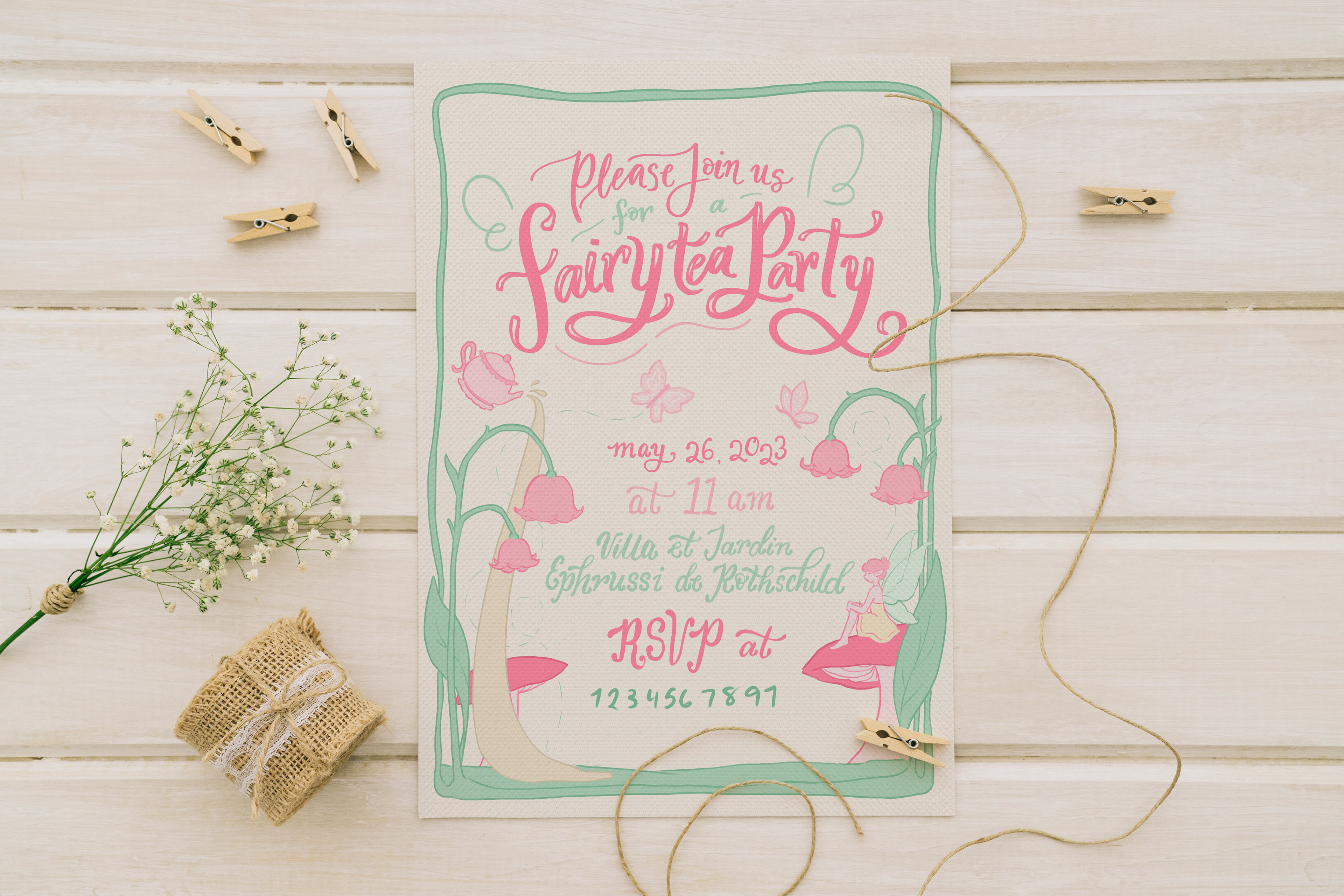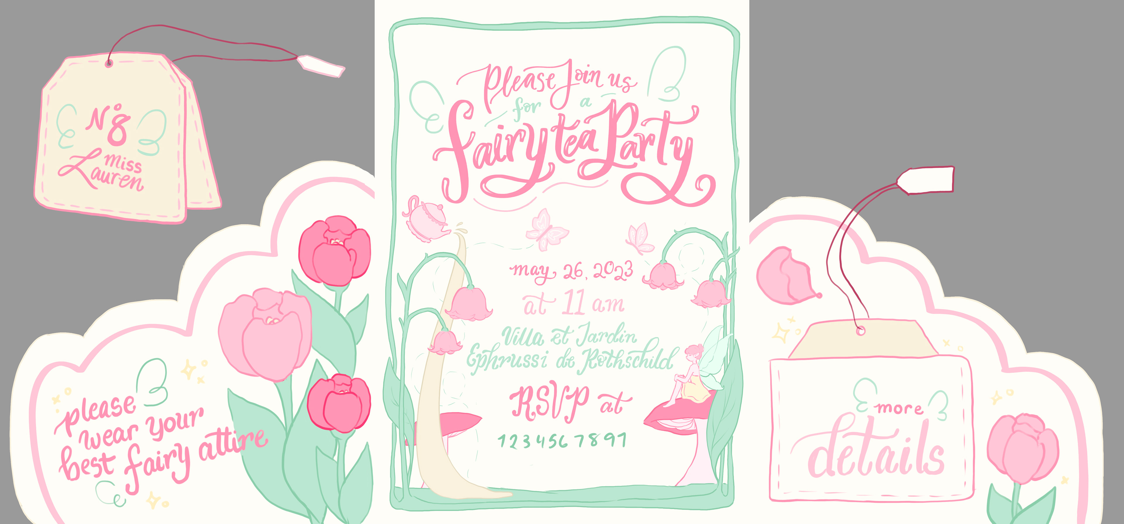 Fairy Tea Party: A stationary collection for a fairy themed tea party. The stationary set includes a tri-fold invitation, a name card, an envelope, a patterned envelope liner, and four fairy garden themed stamps.