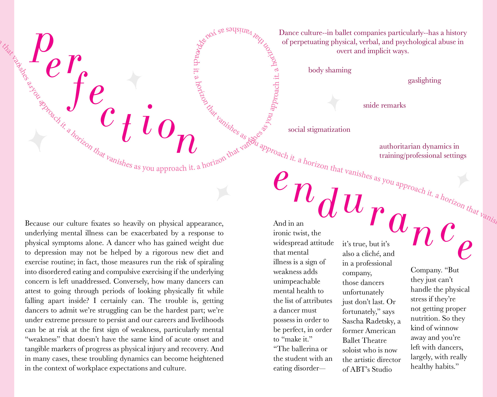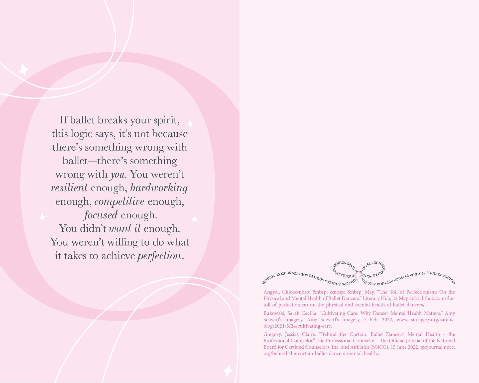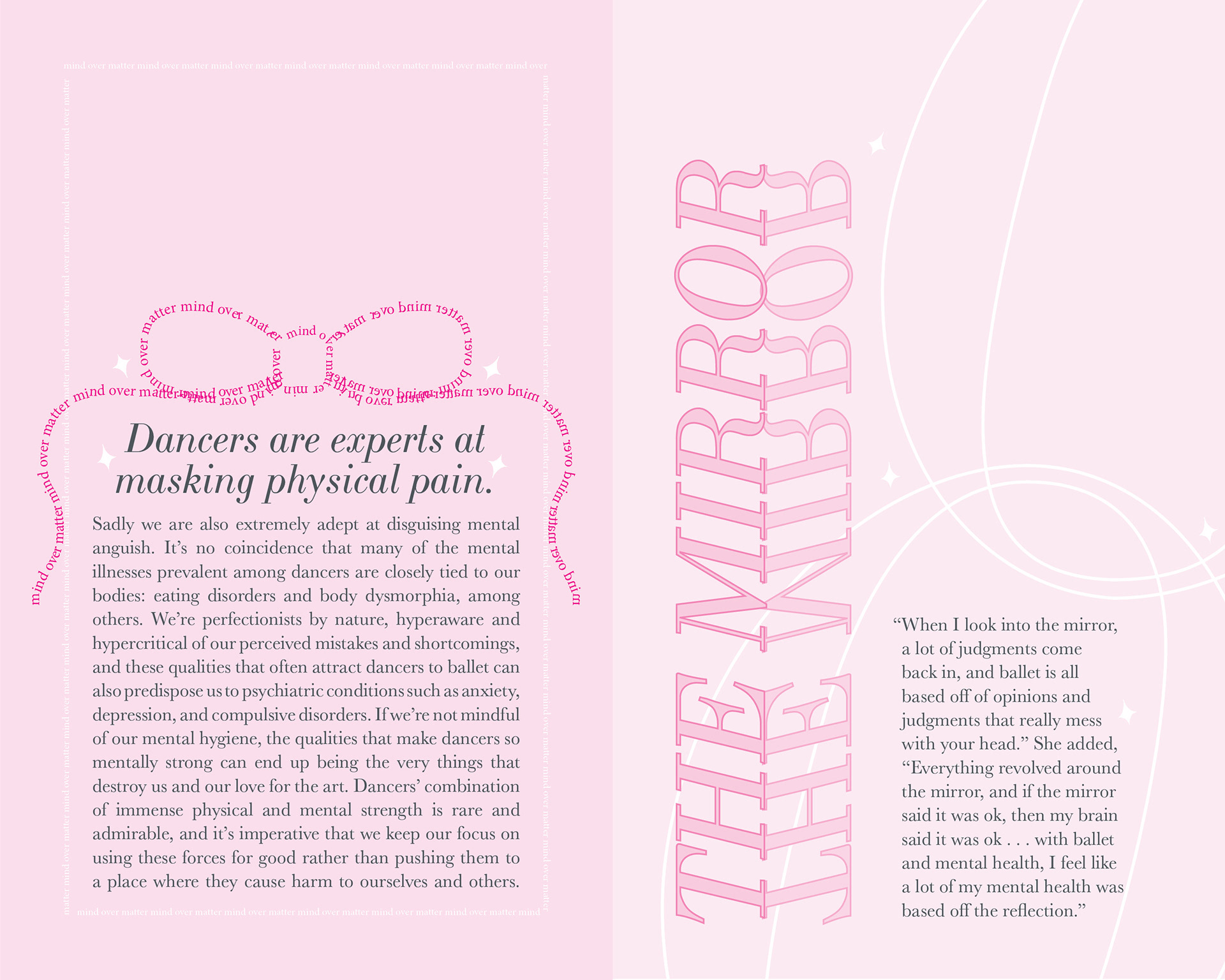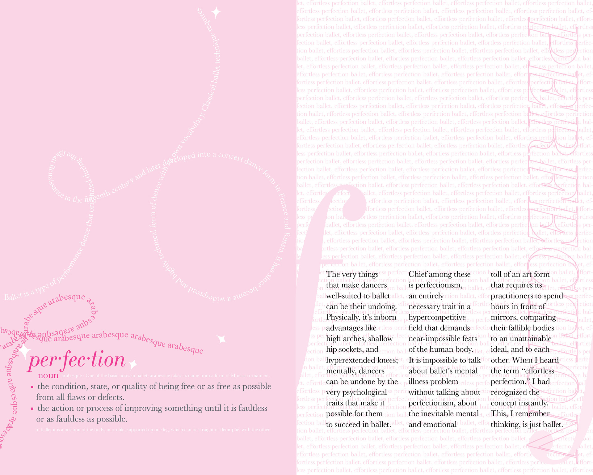 A sixteen page booklet utilizing type to illustrate and speak on the problems in physical and mental health of ballet dancers.